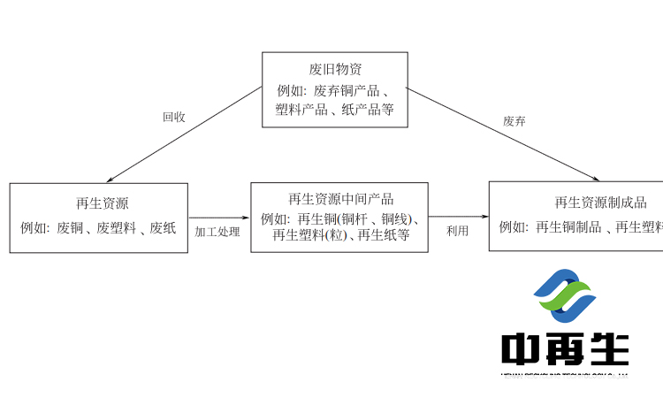 再生資源是指來源于社會生產和生活消費過程的各類廢棄物,經過回收、加工和利用等環節,可以重新獲得使用價值的物質。此外,對符合國家環保控制標準的進口可用作原料的固體廢物也是中國再生資源的一個重要來源。需要注意的是,再生資源與再生資源產品的概念有區別。例如再生銅、再生鋁、再生塑料等概念是指廢舊銅、鋁和塑料經過回收、分揀、熔煉、拉絲造粒等環節加工而成的中間再生資源產品,為制造企業深加工得到再生資源的制成品提供原料,如圖所示: